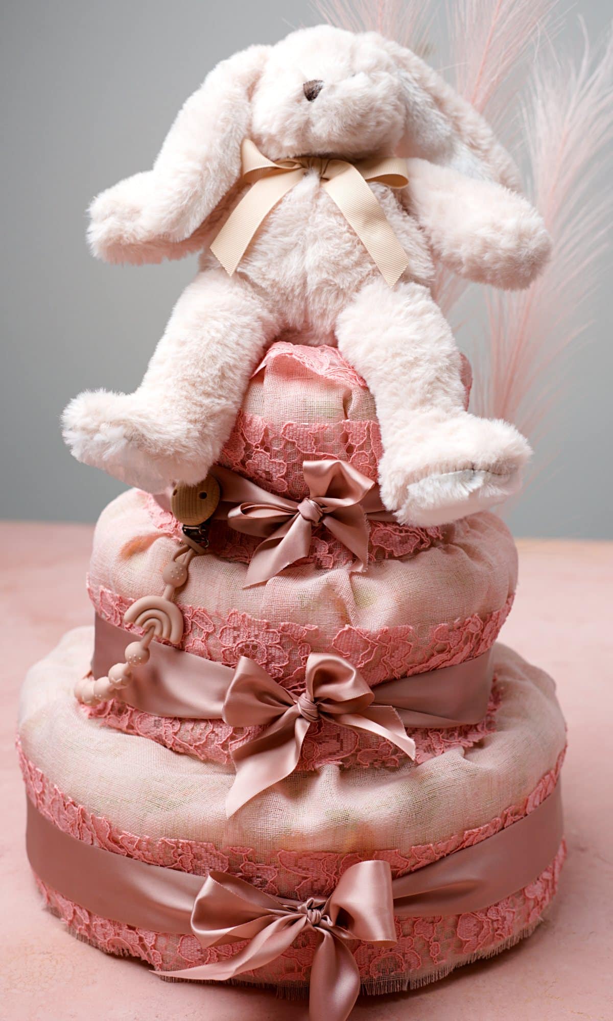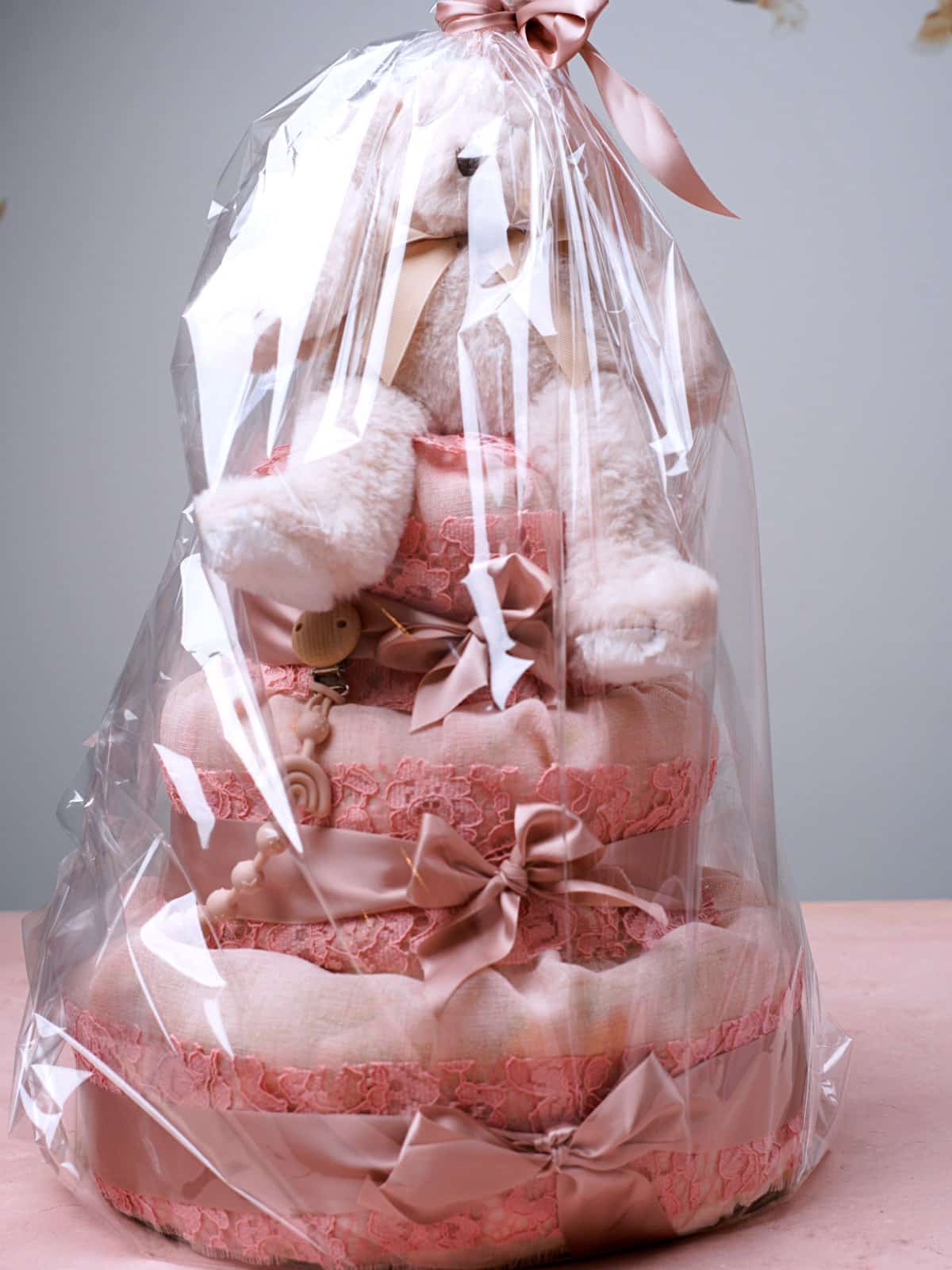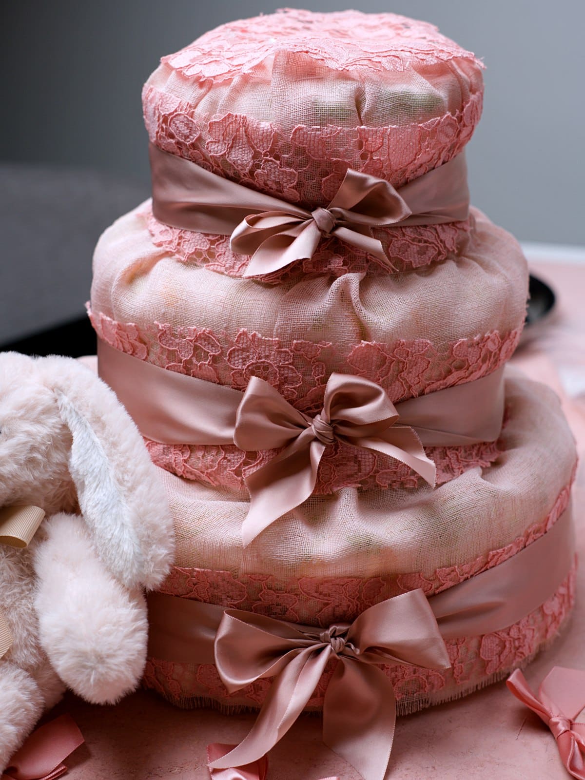 Nyt vauvan sukupuoli oli tiedossa niin meillä oli väriteemana ihana vanha roosa. Vaippakakun voi tehdä hyvin eri kankailla siniseksi, vihreäksi, keltaiseksi tai valkoiseksi. Tai sekoitella eri värejä kangas- ja nauhavalinnoilla.
