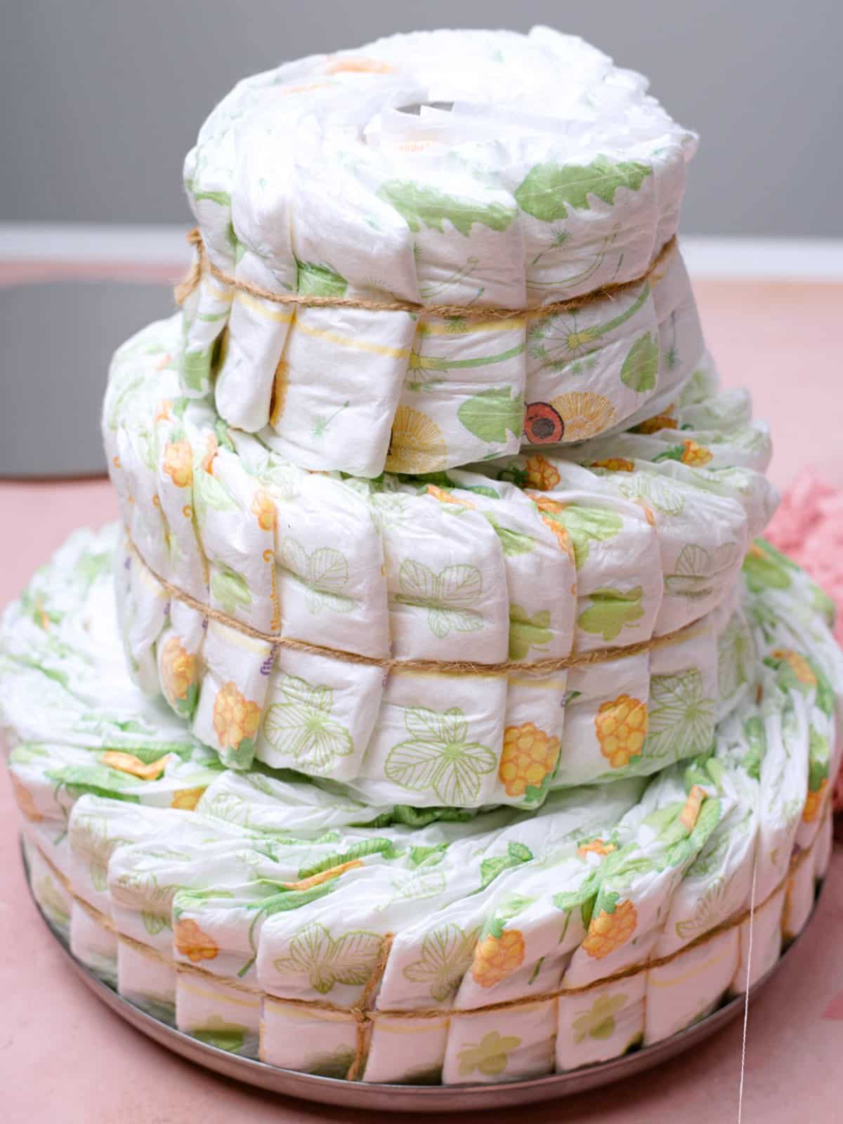 Tämä vaippakakku on päällystetty kankaalla. Alunperin yritin löytää valkoisia vaippoja, mutta se osoittautui hyvin haasteelliseksi, kaikki oli kuvioituja niin siitä syntyi idea hieman erilaisesta vaippakakusta jossa väriteemaa on helppo muokata eri kankailla ja nauhoilla.