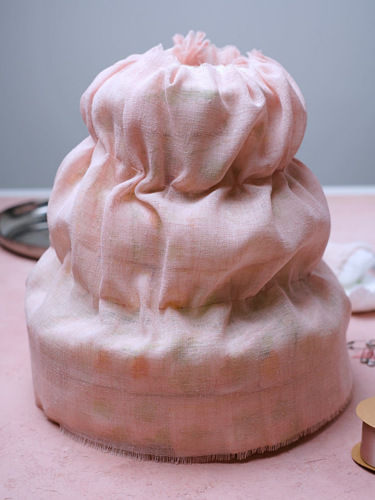 Harsi keskikerrosten reunat ja kiristä langalla niin sinun on helpompi muotoilla seuraava vaihe. Mikäli sinulla ei ole neulaa ja lankaa voit hypätä tämän vaiheen yli ja muotoilla kakun reunat pelkästään pitsillä ja nauhalla. Toinen käsipari voi olla avuksi.